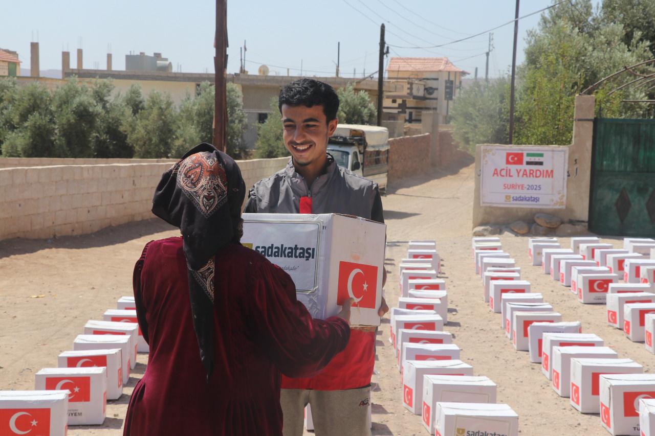 Sadakataşı, Suriye’de yardım çalışmalarını sürdürüyor. Süveyda kırsalında bulunan Sadakataşı ekibi 4 bin aileye içerisinde un, şeker, çay, tuz, pirinç, sıvı yağ, konserve gıdalar, mercimek, bulgur ve salça bulunun gıda kolisi dağıtımı gerçekleştirdi.